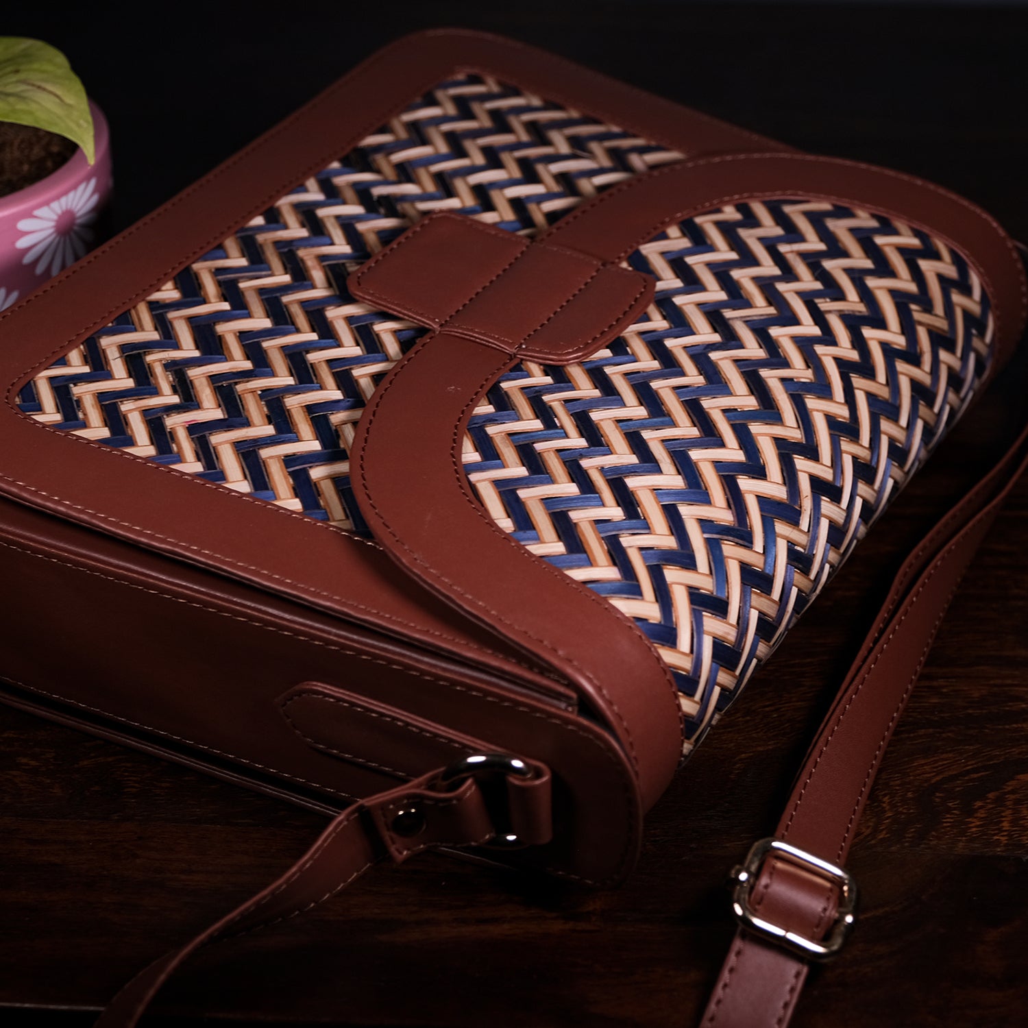 Elevate your everyday style with our latest Sling Bag in blue & biege—where elegance meets craftsmanship. Designed with a distinctive woven pattern, this bag seamlessly blends natural fibres into an eye-catching zigzag texture. Rich brown leather accents complement the design, offering a touch of sophistication and unmatched durability.